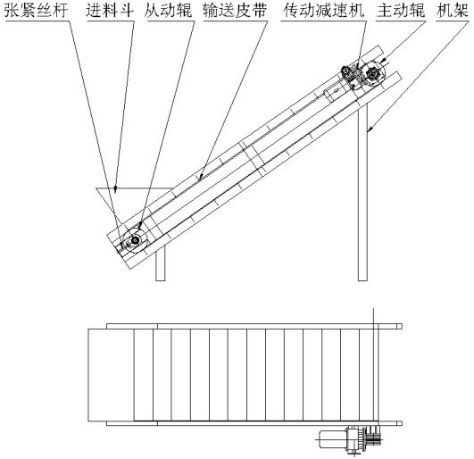 示意圖②:該提升機主要由機(jī)架、進料鬥、張緊(jǐn)絲杆、輸送皮帶、主(zhǔ)動輥、從動輥、傳動減速機等部件組成。
