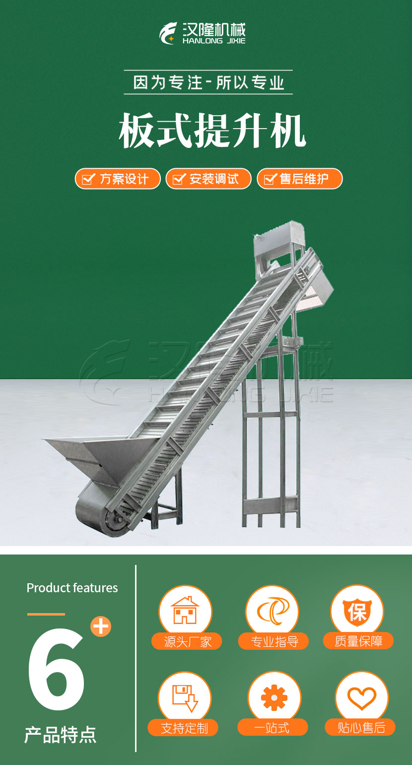 板式提升(shēng)機采用不(bú)鏽鋼板多邊折彎作為輸送提升載體,適用於食品行業各類果蔬的提升輸送。