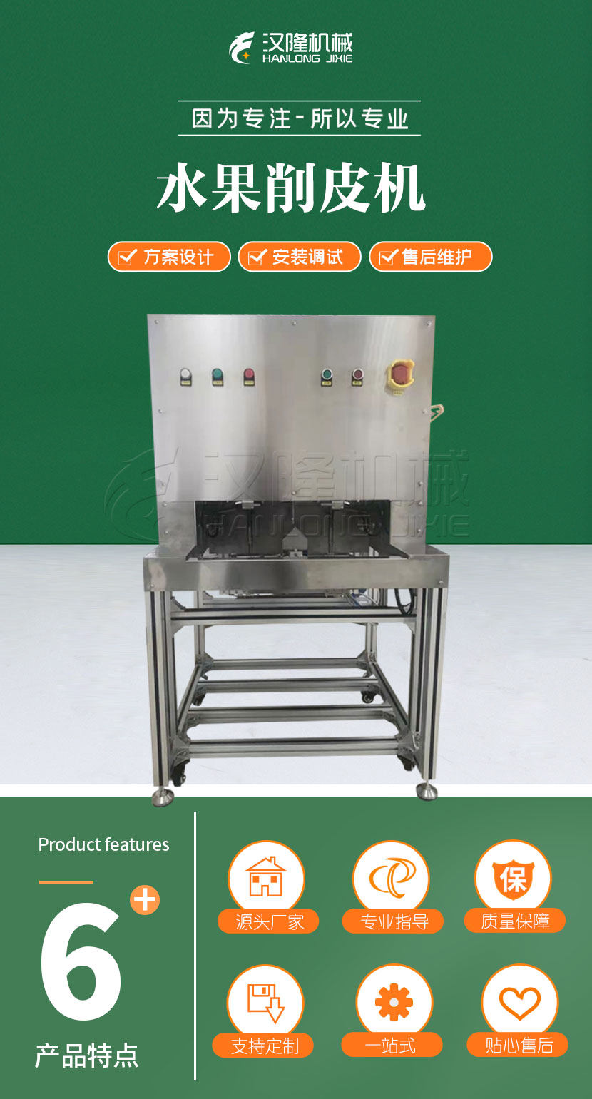 品耐用,維(wéi)護方便(biàn),極大地提高生(shēng)產效率,削皮速度可調,時(shí)間可控,平均每小時削皮(pí)約 1800~2000 個水(shuǐ)果。刀(dāo)具
