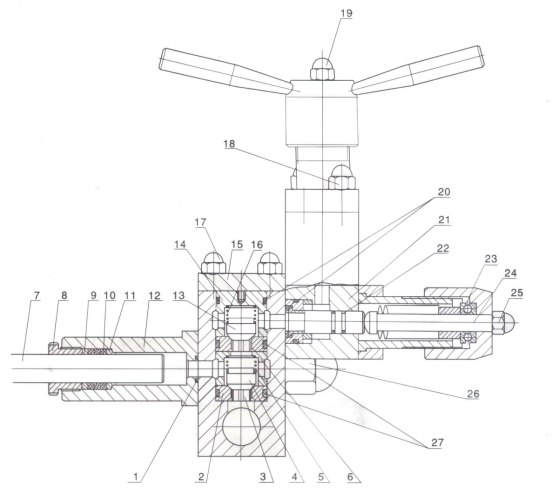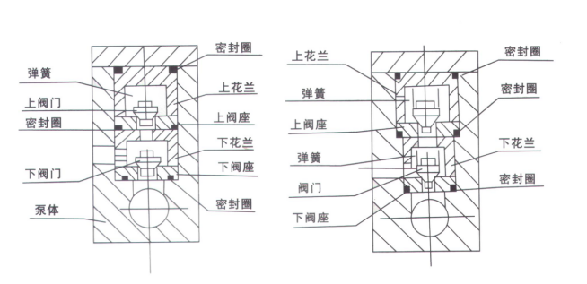 1.O型圈、密封墊圈 2.下閥座 3.導向杆 4.下(xià)閥門 5.下閥門彈簧 6.下花蘭 7.柱塞 8.緊定螺釘 9.壓環 10. 柱塞密封圈 (V型或方(fāng)型 、隔離片) 11.定位套、墊環 12. 柱塞密封套(tào) 13.上閥門 14.上蘭花 15.壓板 16.上閥(fá)門彈簧 17.螺栓、螺母 18. 螺栓、螺(luó)母 19.加壓杆螺母 20.O型圈、密封圈 21.一ji均質閥(fá)體 22.均質杆(gǎn)、O型圈 23.平麵軸承 24.加壓(yā)杆 25.加壓杆螺母 26.泵體螺母(mǔ) 27.上、下閥門密封圈(quān)