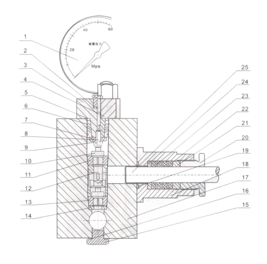 1.壓力表組件 2.表座密(mì)封墊 3.表座壓蓋 4.壓蓋 5.圓錐柱(zhù) 6.壓蓋密封墊 7.緊鎖螺(luó)帽 8.調節螺(luó)帽 9.帶孔緊(jǐn)鎖螺帽 10.錐(zhuī)閥芯 11.上錐閥座 12.限位套 13. 下錐閥座 14.調整墊片 15.螺塞 16.O型橡膠密封圈 17.泵體 18.柱(zhù)塞密封套 19.泵體平麵(miàn)密封圈 20.緊定螺釘 21.壓環 22.柱塞密封圈 (V型或方型) 23.隔離片 24.座環 25.柱塞