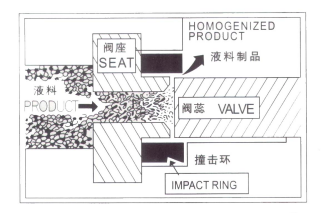 GJJ係列高壓均質機是一種超細粉碎,乳化勻漿設(shè)備,它利用高壓條(tiáo)件下的混懸液(yè),通過一個可調節的限流縫隙過程中失壓、膨脹、爆炸、剪(jiǎn)切和(hé)高速撞擊等綜合效(xiào)應,將在液體中的顆粒和油滴粉碎成很小尺寸,直徑Ø0.1-2um,平均Ø≤1um,同(tóng)時建立理想的乳化液(yè)或分散液。這個過程集(jí)超聲波粉碎機、膠體磨、球磨機、射流機等功能(néng)原理於一體(圖3)。產品的穩定性、一(yī)致性、混合性(xìng)、易吸收性、營養(yǎng)值、保質期、口味、色彩和保活性都可在均質機得以實現。