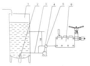 1.料桶 2.濾網 3.管路 4.低壓離心泵 5.換向閥 6.泵體