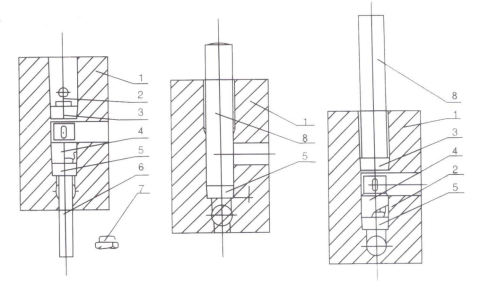 1.泵體 2.椎閥芯 3.上椎閥座 4.限位(wèi)套 5.下(xià)椎閥座 6.敲棒 7.螺塞 8.敲棒(bàng)(附件3)