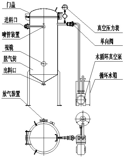 該真空脫氣器屬噴霧式,使(shǐ)用時,隻要開(kāi)啟配套(tào)的真空泵(泵按說明書使用),抽掉器身內的氣體,同時果蔬汁在自身的真空度達到(-0.0906MPa)時進料,果蔬汁吸入器身經過噴嘴時呈噴射(shè)狀向下散開,在具有一定真空度的容器內落下,果蔬汁中約85~90%的氣體被吸走。脫氣果蔬汁流集於底部,從出料管被螺杆泵輸送到(dào)下道工序。為保持脫(tuō)氣的(de)果蔬汁量和上下工序螺杆泵排出量的均衡,進(jìn)料口有閥門控製進料速度,螺杆泵配無級調速來控製出料流量,料液一般為視(shì)孔的一半即(jí)可。隻要保持(chí)真空度,進出料速度均衡時,可連續生產(chǎn)。循環水箱是盛有一定體積的水,其作(zuò)用一是用來承接(jiē)從水環泵排出混有少量水的氣體,水留在容器內而(ér)氣體逸(yì)出,二是(shì)向水環泵提(tí)供(gòng)循環的冷卻水,循環水箱的水溫不能超過30℃,如水溫過高會影響真空度(dù)。