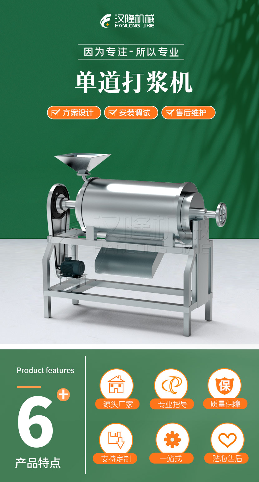 單道打漿機適用於經過破碎預煮後的仁果類以及各類漿(jiāng)果類水果的漿渣分離。